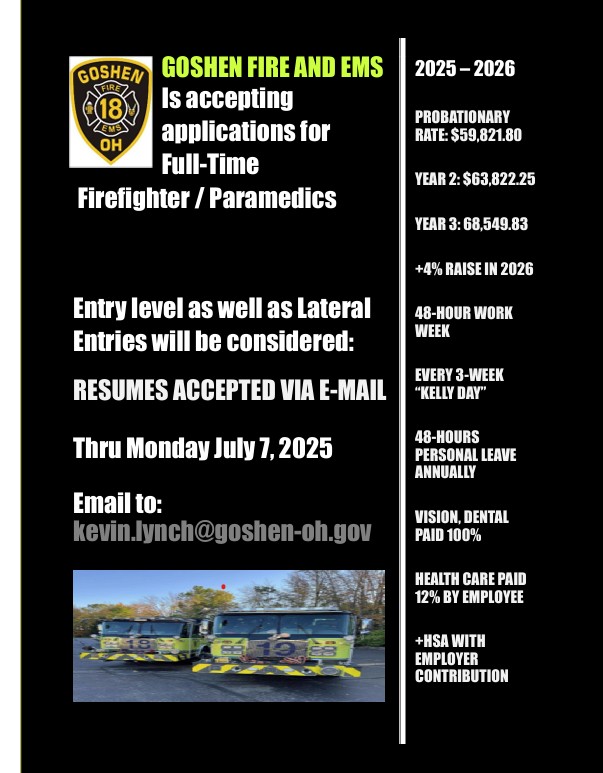 In addition to responding to fire, rescue and EMS calls Goshen is very active with other Community Risk Reduction (CRR) programs. We offer CPR training, Fire Prevention and other Public Education Programs, Lock Box’s, Fire Safety Inspections and routinely attend school/community events to provide safety but also an opportunity to interact with the community and answer questions etc.